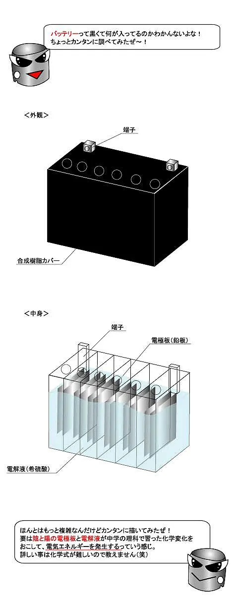 バッテリー液そのものはうすい硫酸ですから体や衣服に付かないように注意が必要です。
