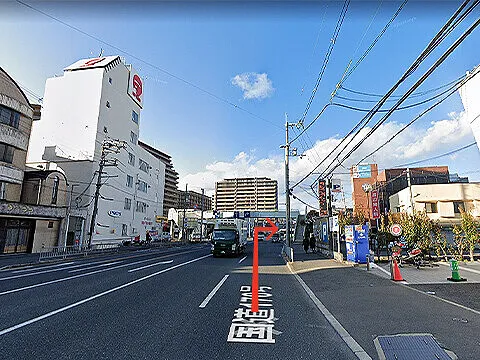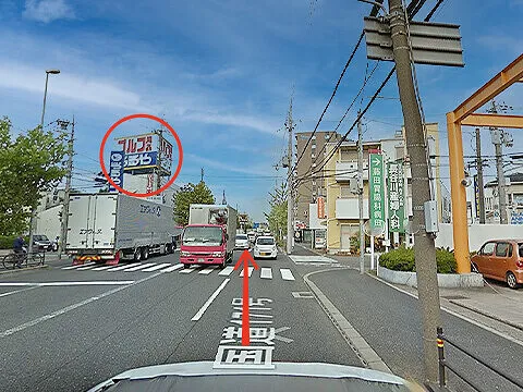 八丁畷交差点、枚方から170号線を通って来られたら時の風景です。レッドバロンさん奥に大きいマンションが見えます。3車線あるので右折専用車線に入って右に曲がって下さい。