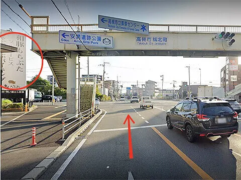 八丁畷交差点、茨木から来た風景です。左に金のぶたがあります。しゃぶしゃぶ食べ放題のお勧め店です。この交差点を超えて300mくらいのところにあります。