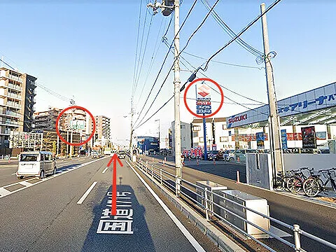八丁畷から少し進むと右にスズキさん、左に業務スーパーさんが見えてきます。もう少し直進して下さい。