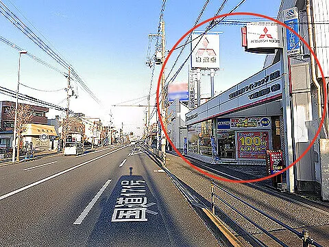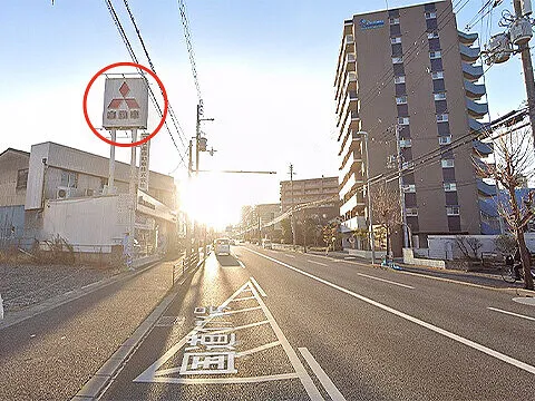 171号線沿い千代田町の交差点、つるやゴルフさんの看板が見えてきます。そこを超えたらすぐに三菱の看板が見えます。木で覆われて隠れている時期もあります。通り過ぎないようゆっくり見つけてください。