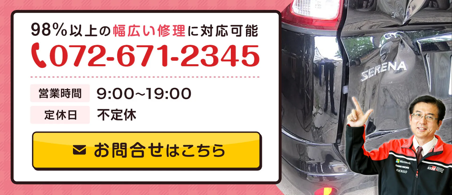 高槻市トップクラスの修理実積と創業50年を超える経験を活かして「費用を抑えたい」「仕上がり重視で」などお客様のご要望を実現します。お見積りは完全無料!小さなキズの修理から事故車まで、車のキズ・ヘコミ修理は何でもお任せください。
