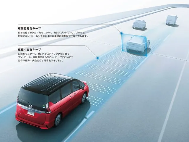 セレナのプロパイロットは、この2つのシーンで、ドライバーに代わってアクセル、ブレーキ、ステアリングを自動で制御。