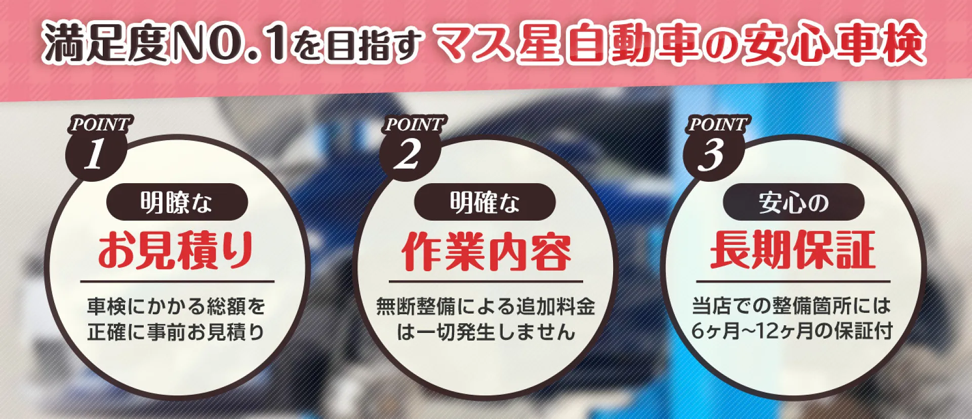 激戦区171号線で創業58年。高槻市にあるマス星自動車は、お客様のご要望に応えた高品質で低価格なオリジナル車検をご用意しております。