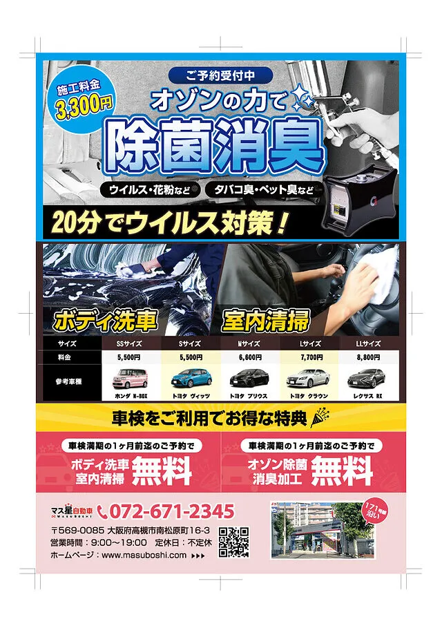 激戦区171号線で創業58年。高槻市にあるマス星自動車はお客様のご要望に応えた高品質なのに低価格のオリジナル車検をご用意しております。