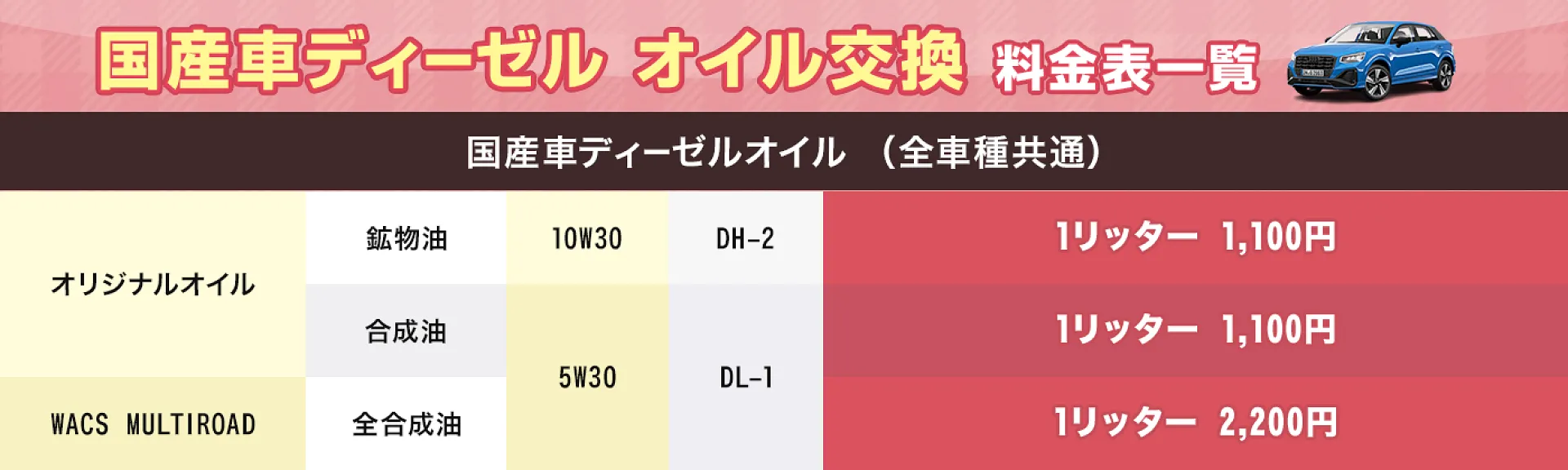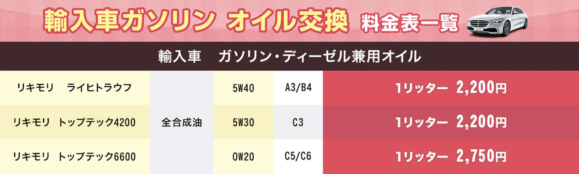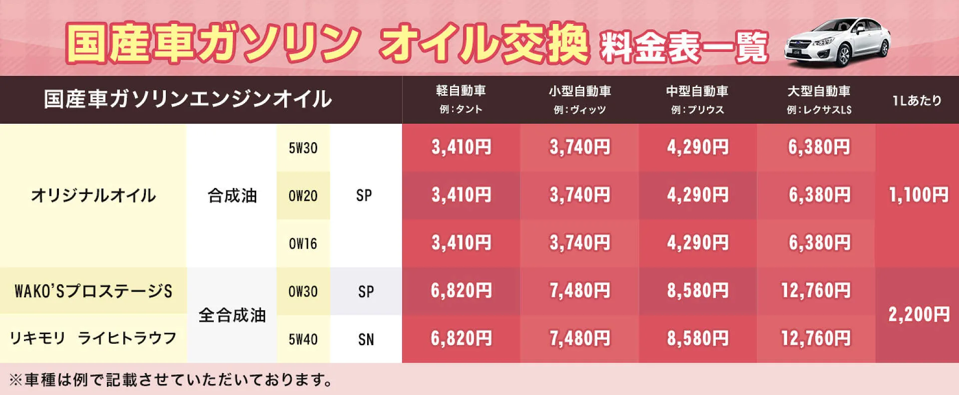 車種によりオイルの金額が変わる場合もございます。