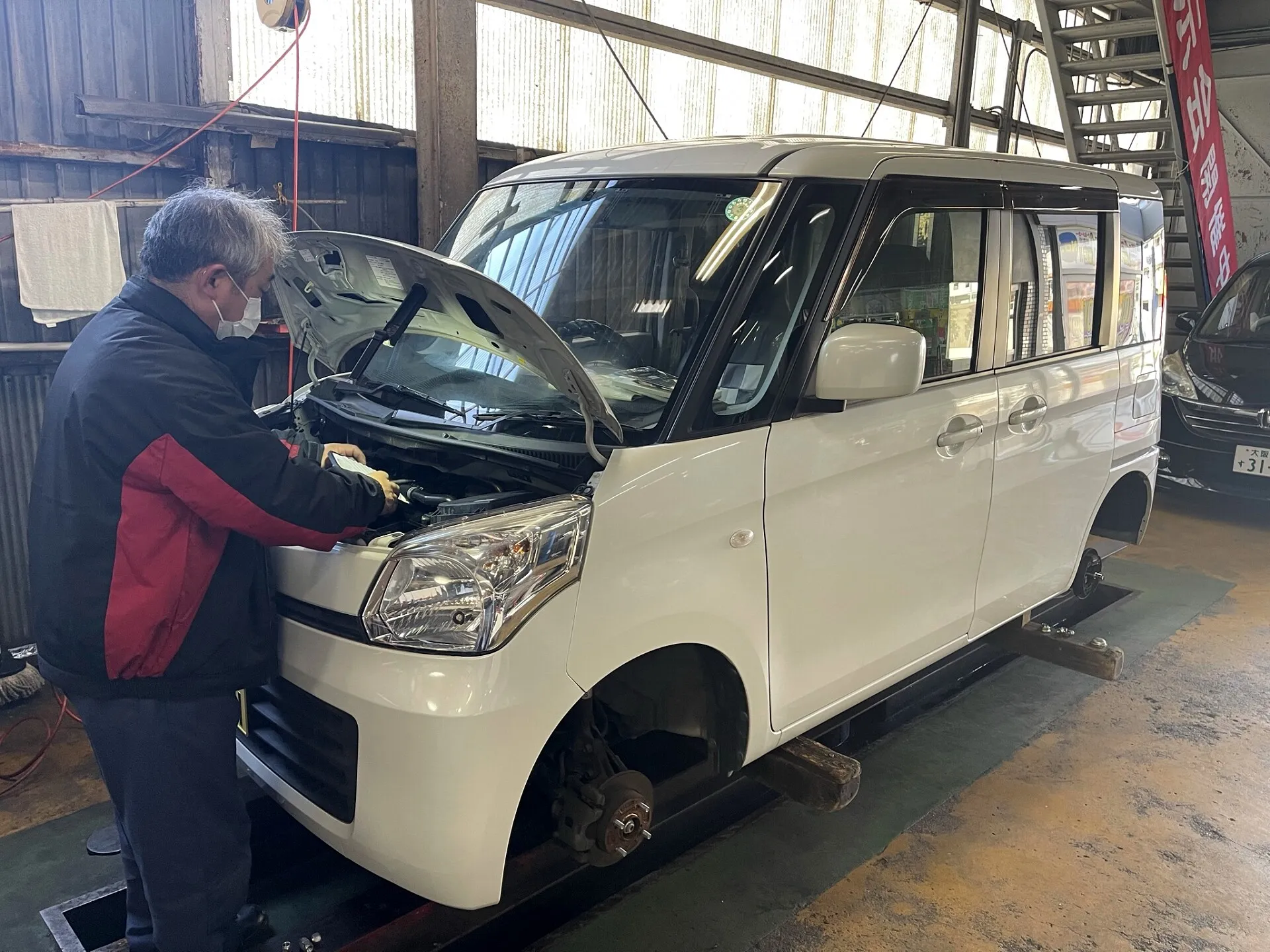 前回も車検でご利用いただいたお客様です。いつもありがとうございます。7年目で走行距離6万kmのスペーシア。定期的にメンテナンスもされてるので特に気になるところはなさそうです。ブレーキパットやブレーキオイルなど、消耗品の交換をいくつかさせていただきました。