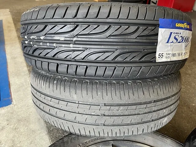 そのため今回は、GOODYEARのEAGLE LS2000 HybridII 165/55R15に交換させていただきました。EAGLE LS2000 HybridII(イーグル エルエスニセン ハイブリッドツー)はコストパフォーマンスが高いことに加え、低振動、静粛性に優れているんです。