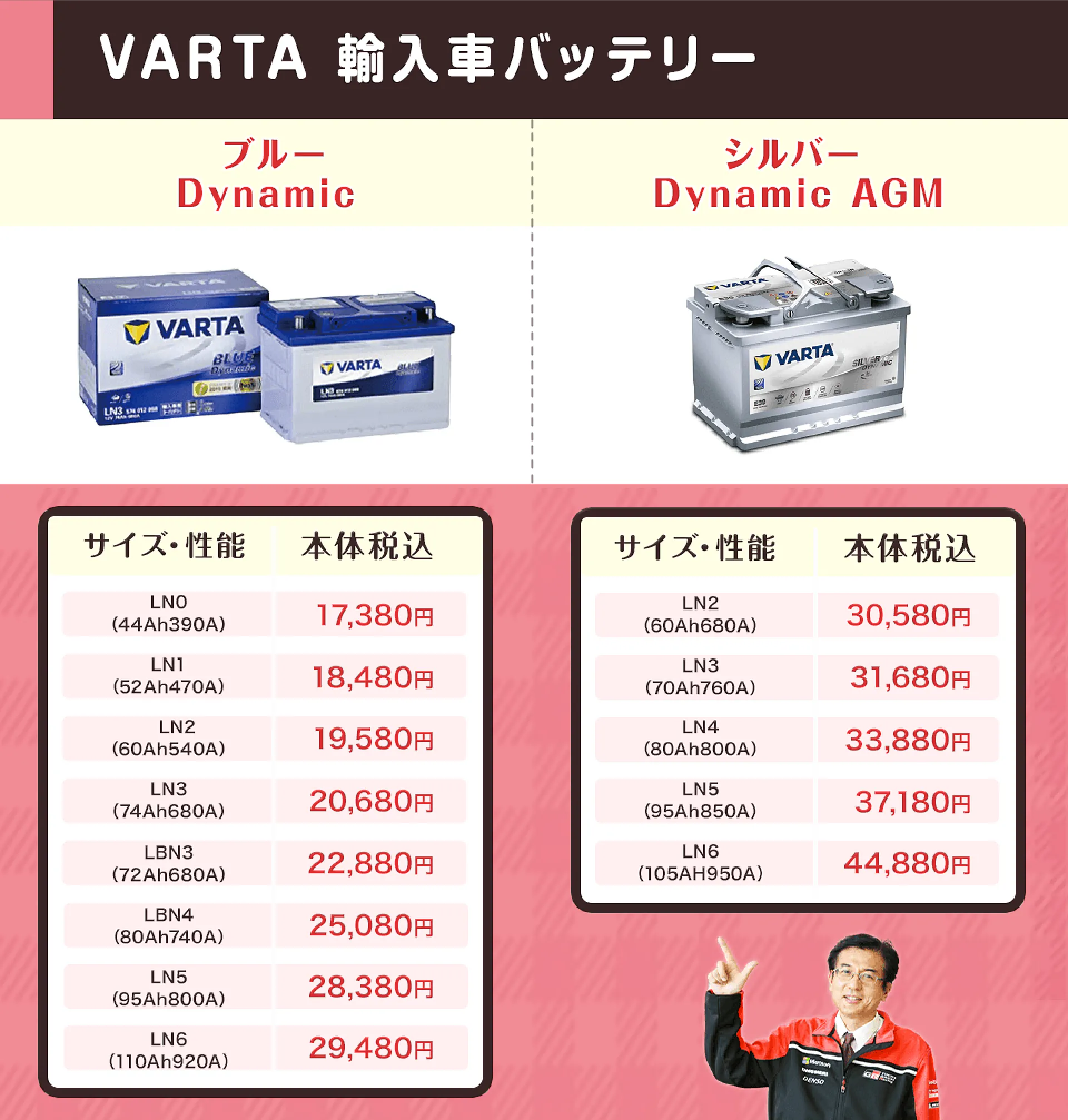 VARTA(ファルタ)は、ドイツに拠点を置く電池メーカー。欧州車の純正装着率がNO.1のEN規格バッテリーです。パワフルかつ、安心のVARTAのバッテリーなので信頼も折り紙付き。マス星自動車では、一番性能の良いバッテリーだけを取り扱っております。