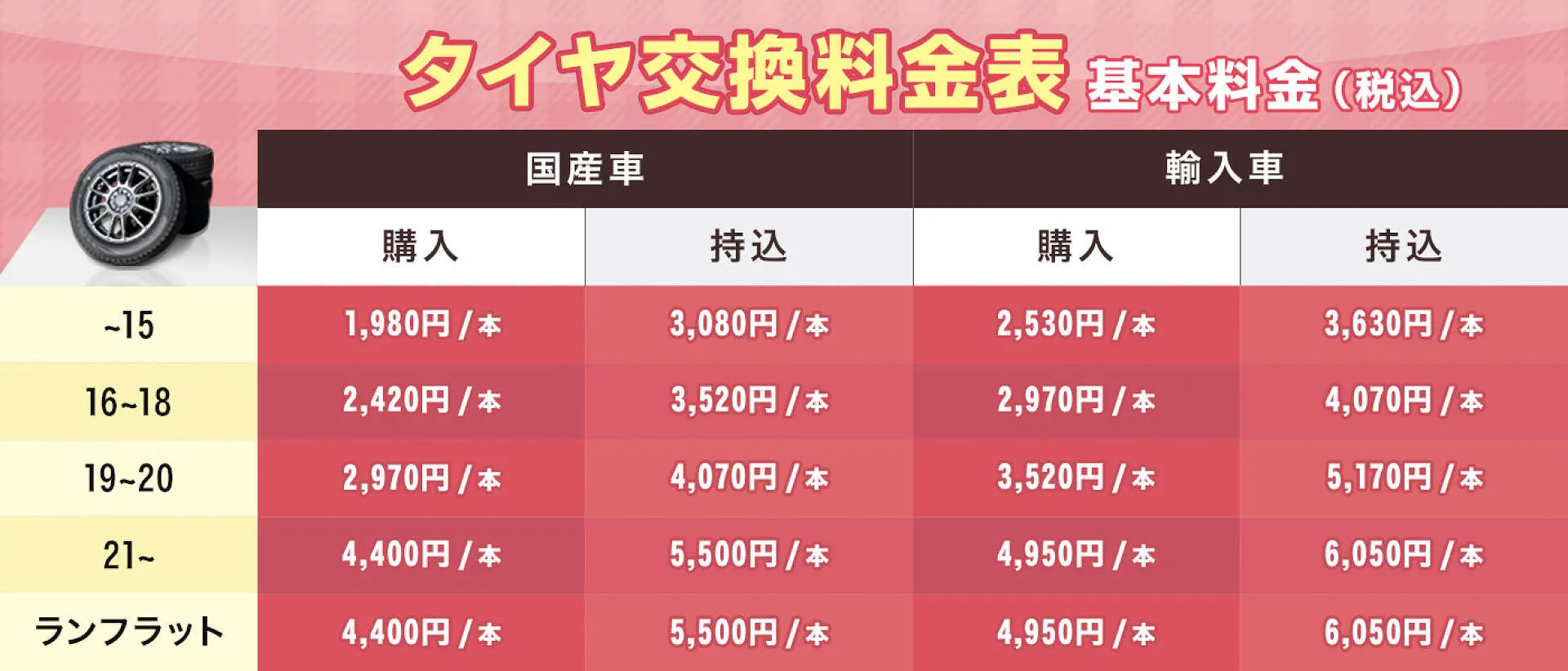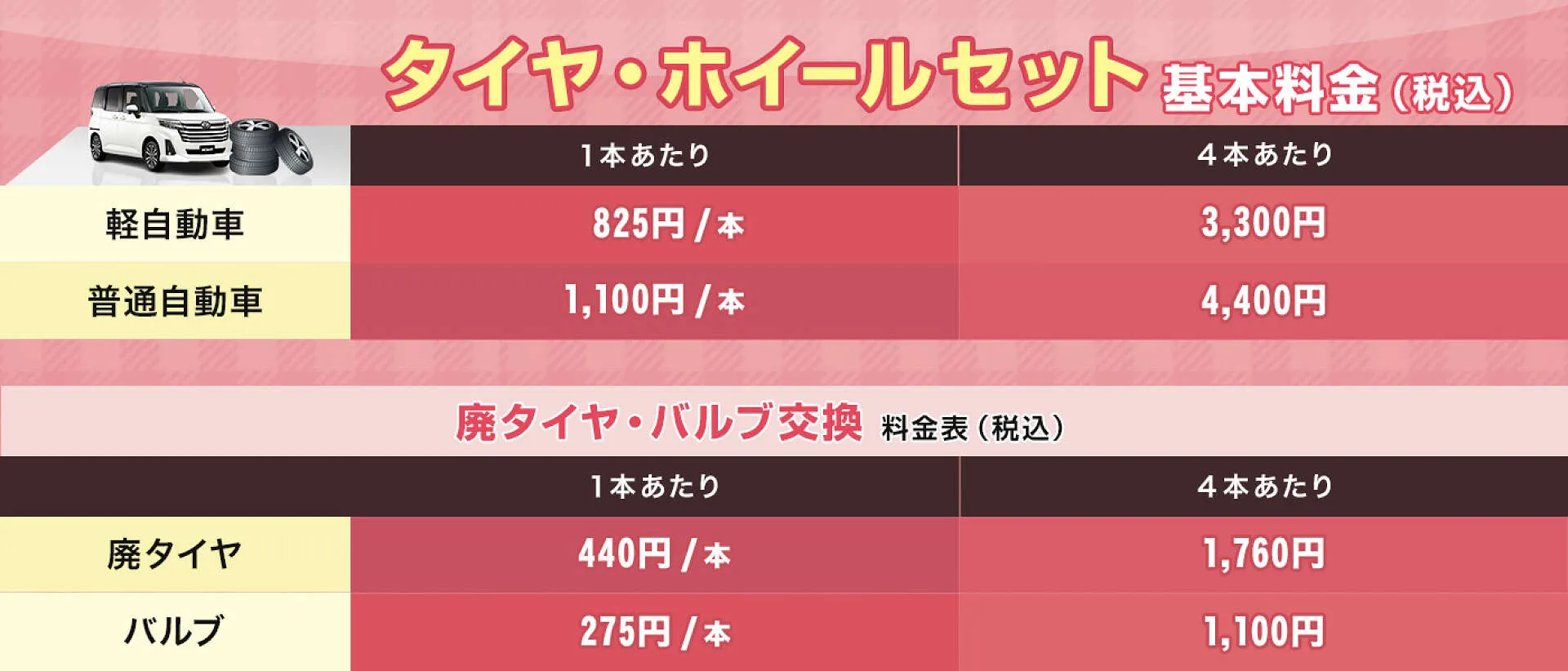 ※廃タイヤ料440円、バルブ交換料275円の別途料金が必要です。(1本あたり)