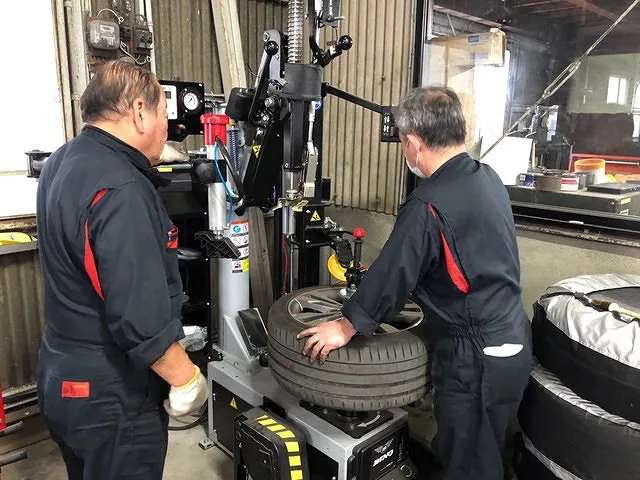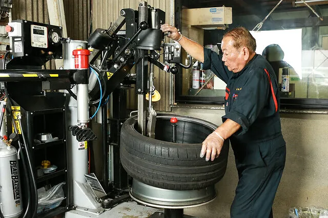 タイヤ交換ホイルバランス調整作業後、最新のタイヤチェンジャーで確実に作業。タイヤ交換の所要時間は、最短で1台30分~1時間程度です。