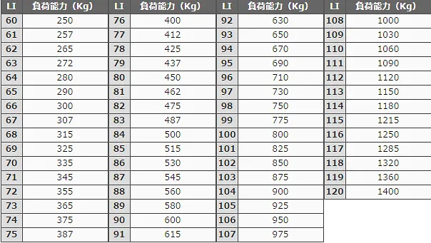 ロードインデックス(LI)は、規定の条件下においてタイヤ1本で支えることができる最大負荷能力を示す指数です。