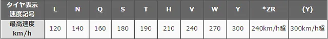 速度記号(スピードレンジ)は、規定の条件下でそのタイヤが走行できる最高速度を示しています。