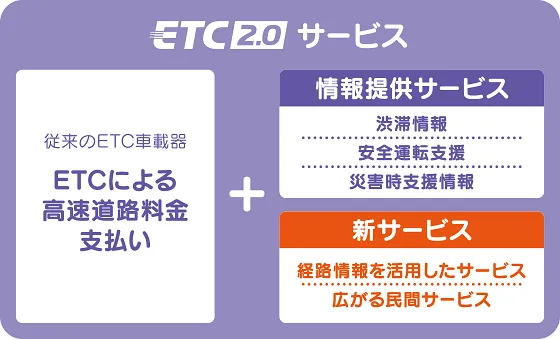 「ETC2.0」とは、いままでのETCの高速道路利用料金収受だけではなく、渋滞回避や安全運転支援といった、ドライバーに有益な情報を提供するサービスです。 さらに今後、街中での駐車場料金支払いや車両の入庫の管理などにETCの多目的利用が推進されています。